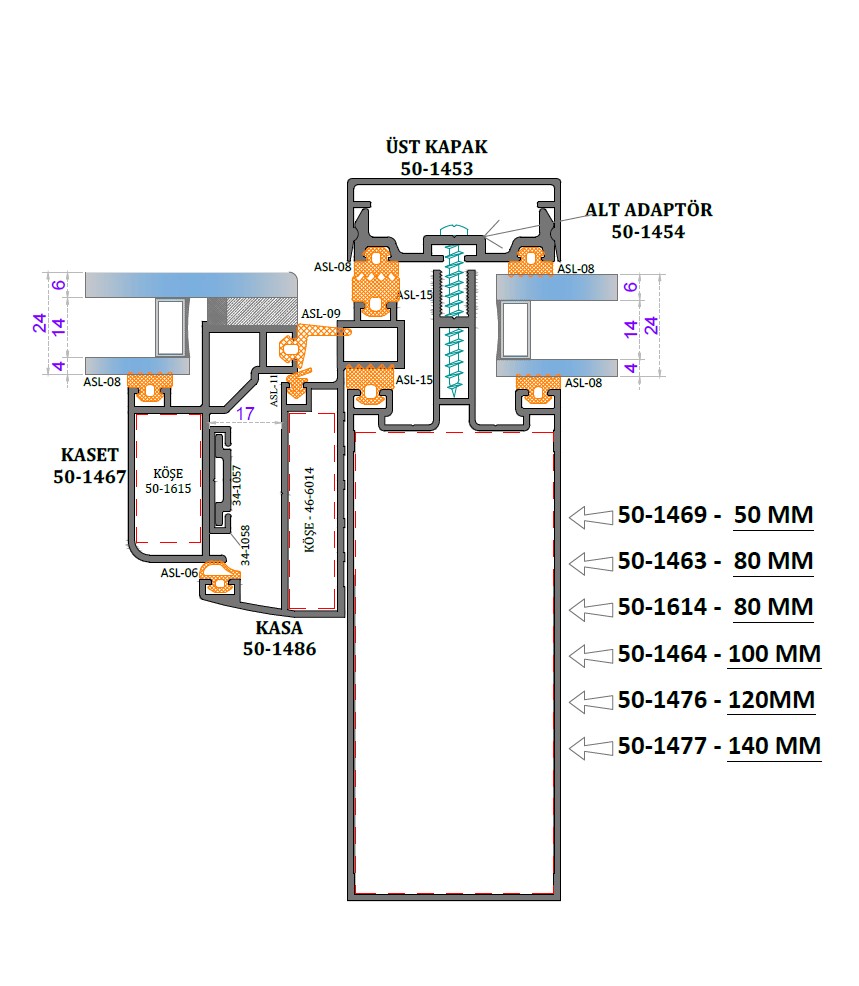 Kasa  Derinlikleri: 50 mm, 80 mm,100 mm,120 mm,140 mm,
